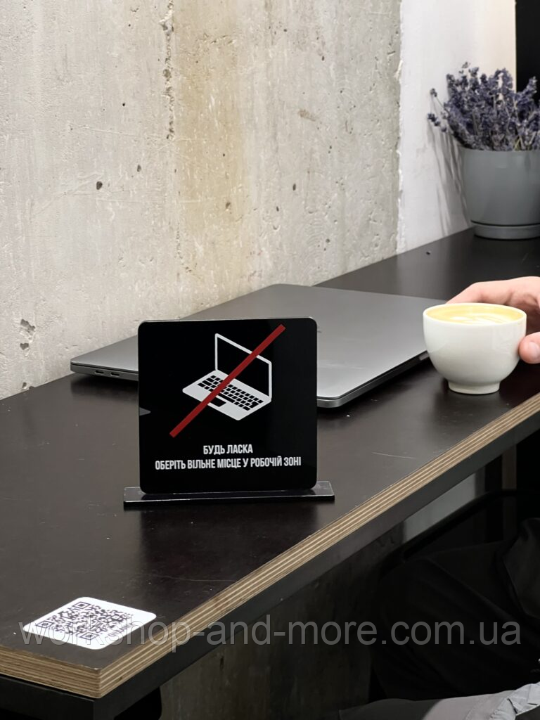 Табличка “Без ноутбука” одразу проінформує гостя або клієнта, що в цьому місці не можна працювати з ноутбуком та іншими девайсами. Табличка допоможе Вам зекономити Ваш час та час гостя. Вона компактна, зручна, естетично виглядає та змістовна. Підходить як для кав’ярень, ресторанів, так і для офісів, готелів і тд.